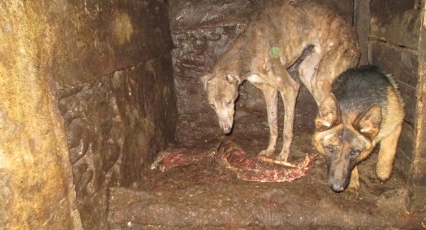 Nine greyhounds and four German shepherds were found locked in sheds and trailers lying in inches of their own faeces.