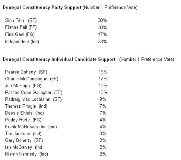 A new opinion poll carried out for TG4 shows that Fianna Fáil is poised to win two seats in Donegal and may well upset Sinn Féin’s plans to take three seats in that newly merged 5 seat constituency.