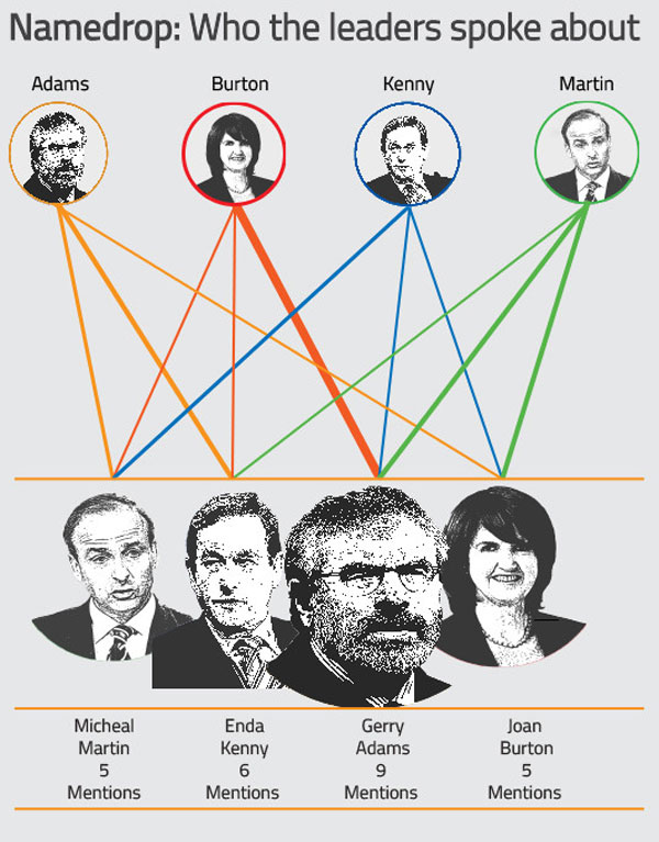 In another shift from last week’s debate, Gerry Adams received the most mentions with Joan Burton leading the attacks, mentioning the Sinn Féin leader six times. (For clarity the thickness of the line indicates the volume of mentions).