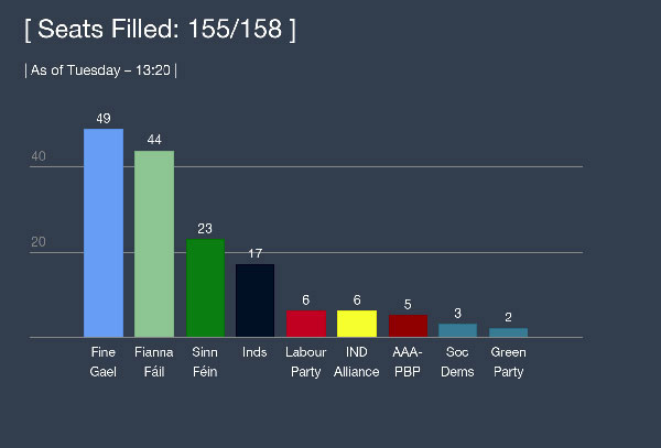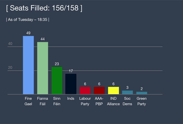 In Dublin South Central, where the final seat remains in contention, a recount resumes at noon today.