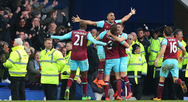 Trailing 2-0 to 10-men Everton - who had Kevin Mirallas sent off in the first half - after goals from Romelu Lukaku and Aaron Lennon the Hammers responded with three goals in the final 12 minutes.