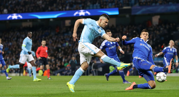 Sergio Aguero did get in a shot but slipped in doing so and it curled well wide.
