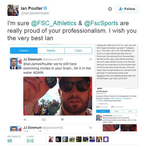 Poulter, 40, saw the tweet and took screen shots, then tagged college accounts in his response, which said: "I'm sure @FSC_Athletics & @FscSports are really proud of your professionalism. I wish you the very best Ian."