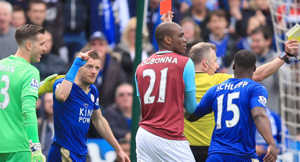 Vardy responded furiously, pointing and shouting in the face of referee Jonathan Moss before leaving the pitch following his tangle with Angelo Ogbonna.