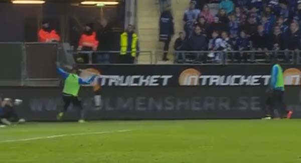 Although appearing unhurt, he was enraged and headed toward the corner of the field. The player picked up the corner flag and flung it directly into the crowd of Gothenburg supporters.