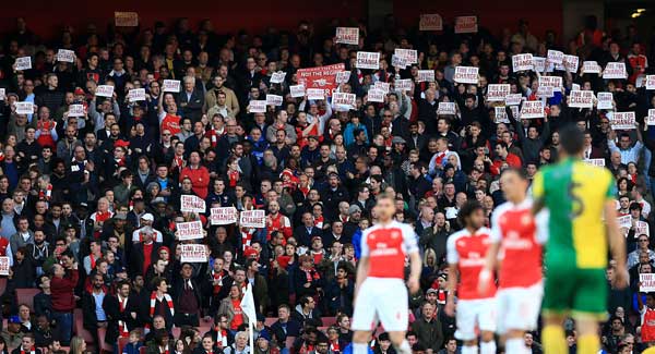 Posters reading ‘Time For Change’ and ‘Arsenal is stale – fresh approach needed’ were held up during the Gunners’ 1-0 victory over struggling Norwich on Saturday.