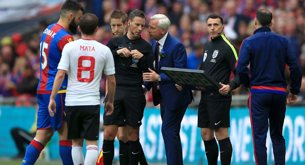 Palace boss Pardew joined in the fun but their delight did not last long as, just four minutes later, Rooney wriggled his way to the byline and lofted a cross into the danger area. Fellaini chested down and Mata ran in to equalise.