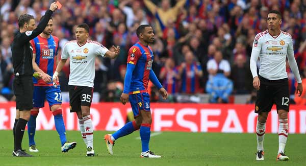 United lost defender Chris Smalling in extra time after he hauled back Yannick Bolasie to incur a second booking but United snatched victory with a fine volley from substitute Lingard after 110 minutes.