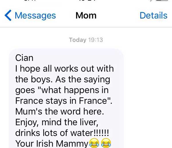 Kay Galvin, 55, told her son: “Cian I hope all works out with the boys. As the saying goes ‘what happens in France stays in France’.