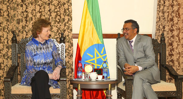 Ms Robinson met Ethiopian foreign minister Tedros A Ghebreyesus in Addis Ababa as the country seeks €580m in aid to ease the crisis.