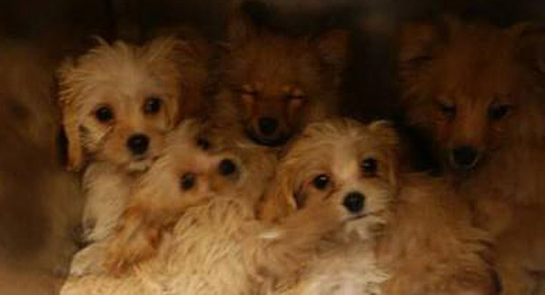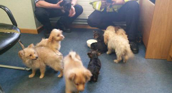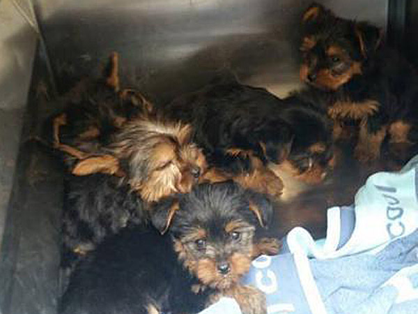 The puppies, of various breeds, were all contained in two small metal containers.