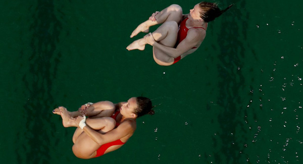 After being the standard blue for the men’s diving the night before, it turned a deep green by the time the women’s competitions were underway.