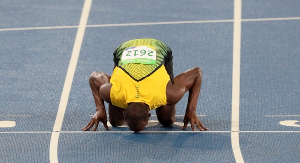 Usain Bolt knelt down to kiss the finish line goodbye as he greeted an emotional eighth Olympic title with a mixture of frustration and relief in Rio.