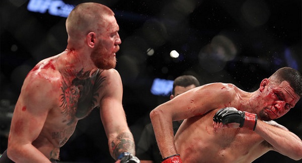 Once the ring was cleared they went at it early and often, McGregor bloodying and bruising Diaz with big lefts in the first then dropping him to the floor, something he hadn’t done first time round. He summoned the veteran back and they traded shots that left Diaz’s right eye bruised.