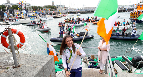 A huge crowd turned out to greet Ireland’s silver medal winning Olympian, who arrived into the port in a flotilla.