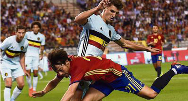 Belgium, captained by Eden Hazard in the continued absence of Vincent Kompany, were struggling to make an impact on the game and could have fallen further behind when Bayern Munich man Thiago volleyed into the ground and over after being picked out by the lively Vitolo.