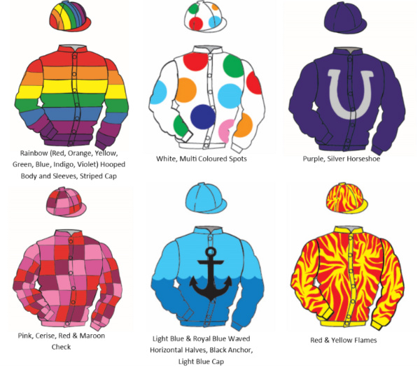 Three set of colours feature horseshoe, anchor and rainbow designs respectively, while the other three are vibrant sets of silks in multi-coloured spots, flames and four bright shades of red.