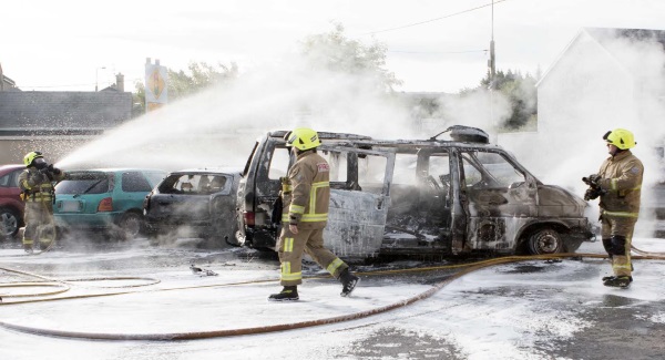 The fire quickly took hold and spread to a nearby car. Two units of the fire brigade from Ennis rushed to the scene where they found both vehicles well alight.