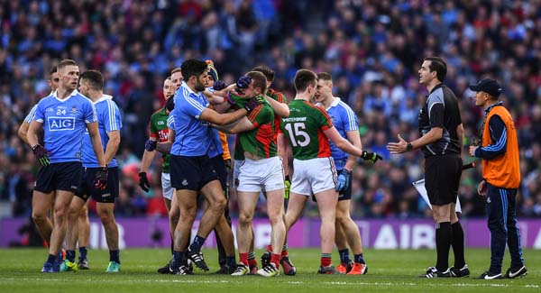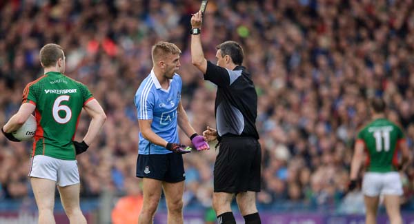 Referee Maurice Deegan was the talk of the first half having neglected to black or red card John Small for obvious incidents. Instead, the referee chose to dismiss Jonny Cooper and Lee Keegan for cynical if not black card offences.