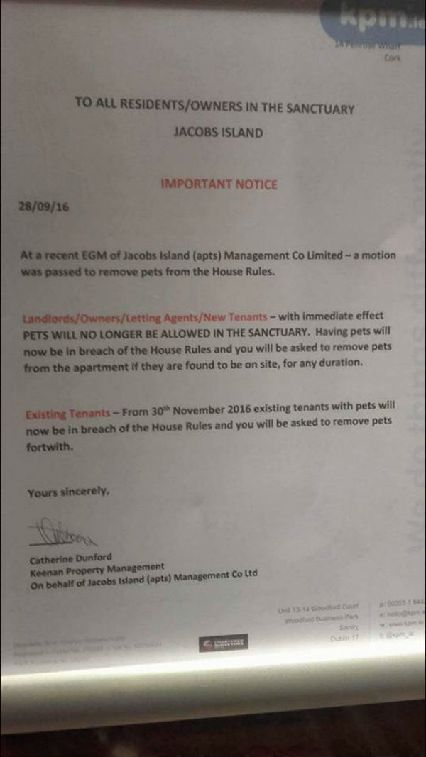 Residents of The Sanctuary apartment building in Jacobs Island in Cork have been told that pets are no longer allowed, writes Claire Anderson.