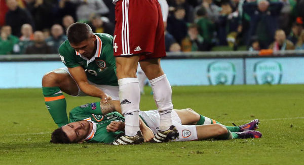 Brady crumpled to the ground after a nasty-looking clash of heads with Solomon Kverkvelia during the second half of last night’s World Cup qualifier against Georgia.