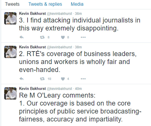 The deputy director general of RTE Kevin Bakhurst took to twitter today to defend the station against incendiary comments by Ryanair boss Michael O’Leary.