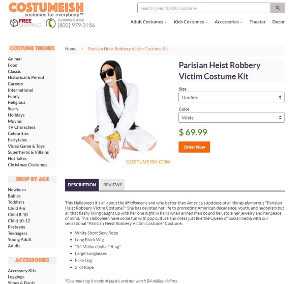 The costume, titled ‘Parisian Heist Robbery Victim Costume Kit’,comes complete with a “fake gag”, a “white short sexy robe”, two inches of rope, a wig, sunglasses and ring, all for a total of €64.