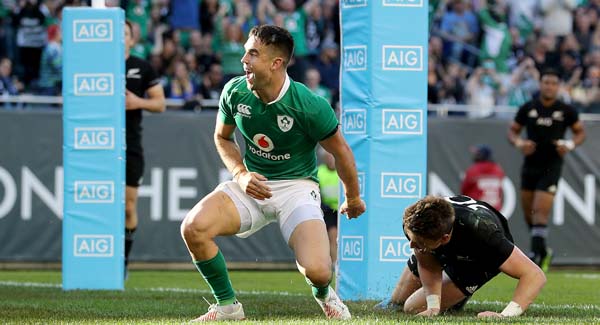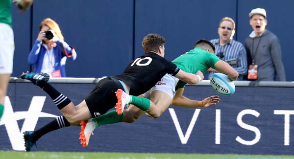 A Simon Zebo kick ahead causing panic in the backfield, Conor Murray tagging a back-peddling Julian Savea in the New Zealand wing’s in-goal area and from the subsequent five-metre scrum, Jamie Heaslip peeling off the base to feed Robbie Henshaw for the winning try, converted by 21-year-old debutant Joey Carbery.