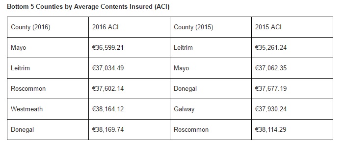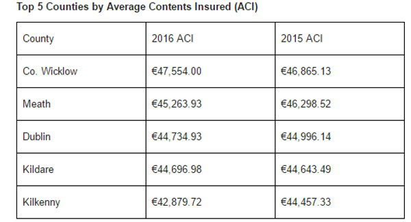 While the top five counties by average contents insured remained unchanged from 2015, there was a slight dip in the average value of contents insured by homeowners in Meath and Dublin.