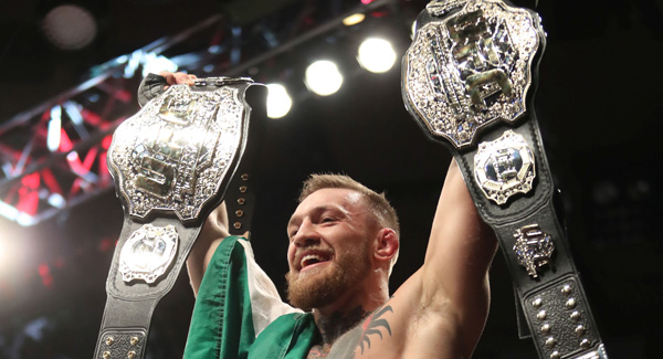 Alvarez’s challenge never materialised. It wasn’t given a chance to. McGregor was all over the 32-year-old early and often, knocking him down three times in the opening three minutes – each time with that wrecking ball of a left. In the end – which came with about two minutes before the end of the second – a blurring combination of two lefts and two rights put Alvarez out of his considerable misery. After a delay getting the second piece of hardware into the octagon, McGregor grasped both belts, straddled the top of the cage and raised them aloft.