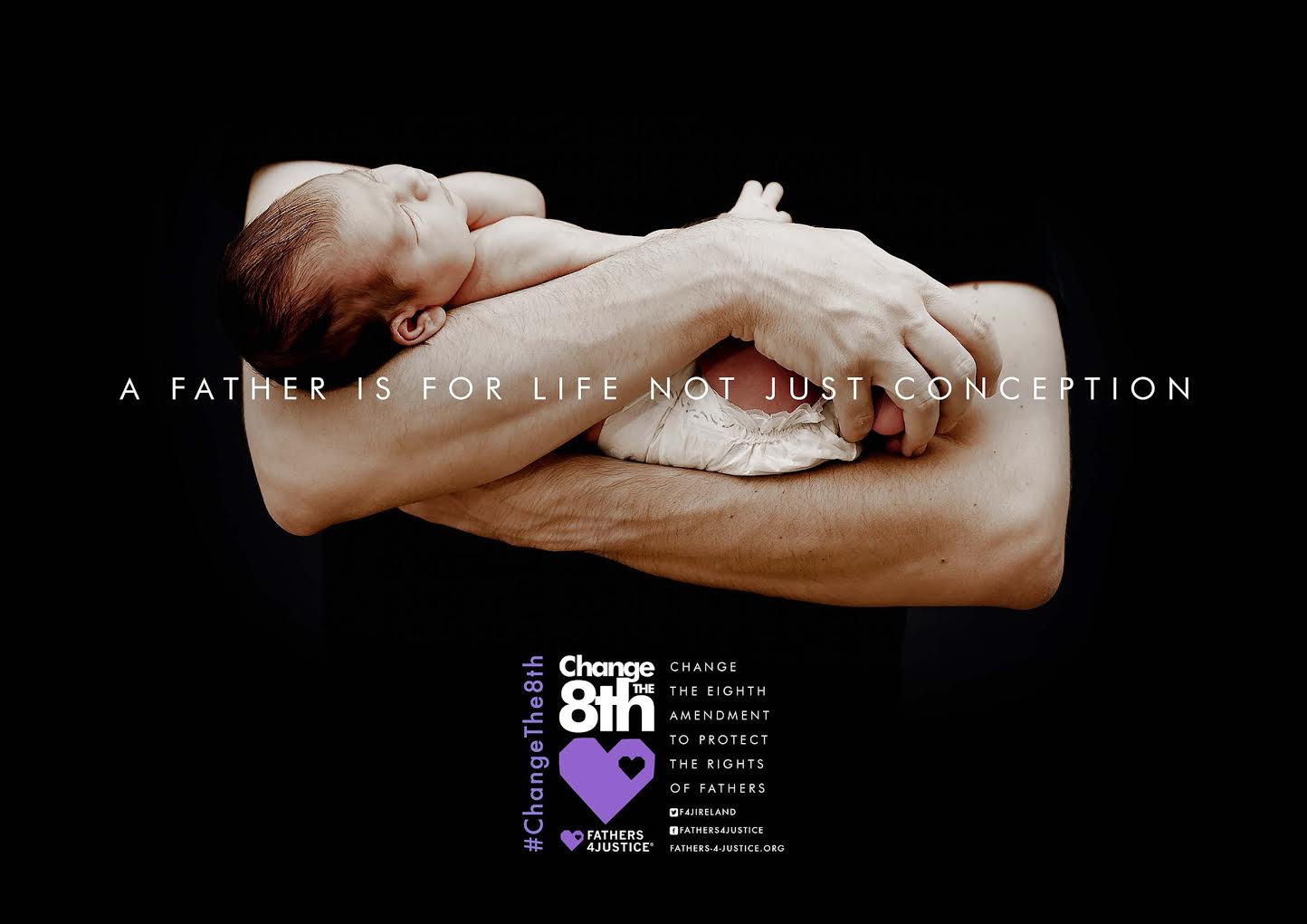 The campaign poster features a picture of a man cradling a newborn child with the words ‘a father is for life not just conception’ above a ‘Change The 8th’ logo.