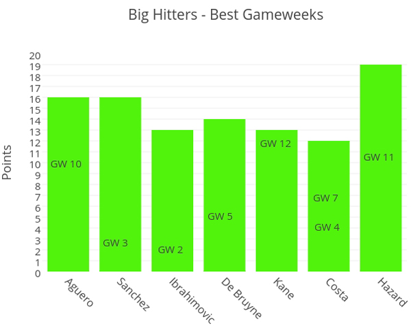 Eight of Aguero’s 10 goals have come away from home, for instance. Alexis Sanchez (ARS, 11.4) has registered more shots on target away from the Emirates, while most of Hazard’s double-figure hauls, including those 19 points, have come at home.