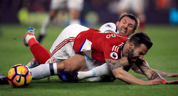 The Teessiders, galvanised by their equaliser, felt they should have had another spot-kick when Cristhian Stuani went down under Allan Nyom’s challenge but referee Stuart Attwell was this time unmoved.