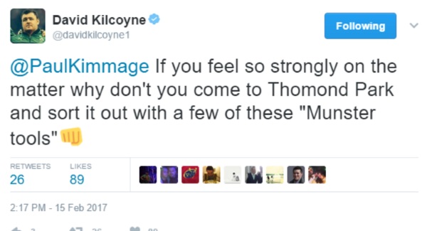 An hour later Munster prop Kilcoyne answered, saying: “If you feel so strongly about it why don’t you come to Thomond Park and sort it out with a few of these “Munster tools”.”