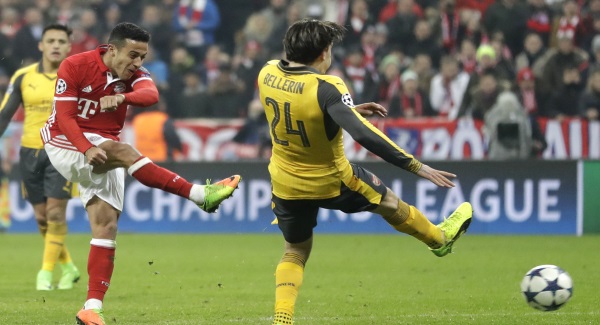 Bayern dominated possession for much of the opening half as Arsenal remained boxed in defensively, although Sanchez won a free-kick on the edge of the penalty area after bursting forward at pace and being fouled by Mats Hummels.