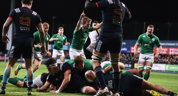 TIME LINE: 14 minutes – Ireland try: Tadgh McElroy – 5-0; conversion: Bill Johnston – 7-0; 23 mins – France penalty: Romain Ntamack – 7-3; 24 mins – Ireland try: Tommy O’Brien – 12-3; conversion: Bill Johnston – 14-3; 30 mins – Ireland try: Oisin Dowling – 19-3; conversion: Bill Johnston – 21-3; 36 mins – France try: Faraj Fartass – 21-8; conversion: Romain Ntamack – 21-10; Half-time – Ireland 21 France 10; 45 mins – Ireland penalty: Bill Johnston – 24-10; 61 mins – France try: Faraj Fartass – 24-15; conversion: missed by Romain Ntamack – 24-15; 66 mins – Ireland yellow card: Sean Masterson; 71 mins – France try: Penalty try – 24-20; conversion: Romain Ntamack – 24-22; 74 mins – Ireland penalty: Bill Johnston – 27-22; Full-time – Ireland 27 France 22