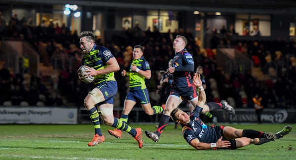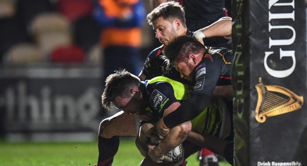 Fly-half Ross Byrne kicked seven conversions against Dragons tries from wing Adam Hughes, lock Matthew Screech and one at the end from replacement scrum-half Sarel Pretorius. Fly-half Dorian Jones booted two conversions and a penalty.