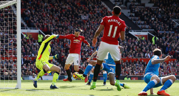 A minute later United had the chance to strike a decisive blow as Smith was adjudged to have handled a Pogba cutback. Ibrahimovic stepped up for the spot kick, only to be denied by a fine Boruc save low to the keeper’s right.