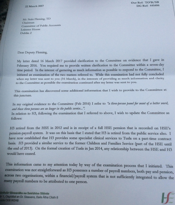 “H3, while retired from the HSE, is currently in public services on a part-time basis in Tusla,” Mr O Brien wrote.
