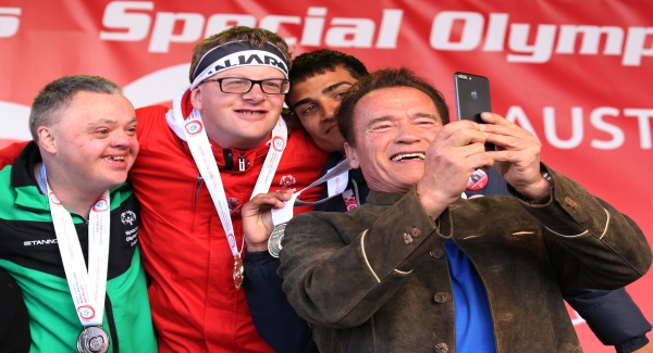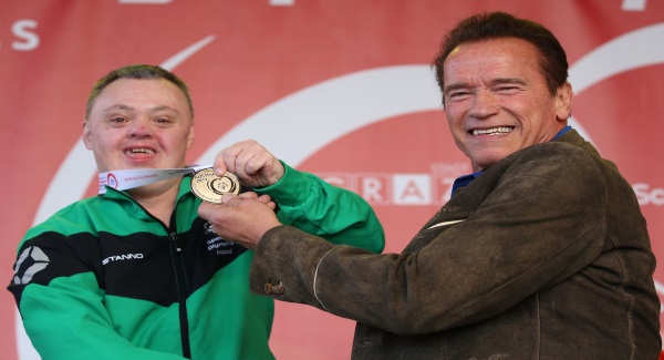 Cyril Walker from Co. Armagh, who claimed Silver in the Novice Slalom, was presented with his Silver medal by Special Olympics ambassador, Arnold Schwarzenegger.